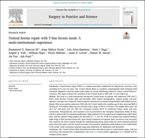 Emovon, E. O., Oyola, A. M., Arias-Espinosa, L., Naga, H. I., Volk, A. S., Hope, W., Malcher, F., Levine, J. P., Harris, H. W., Yoo, J., & Patel, A. (2025). Ventral hernia repair with T-line hernia mesh: A multi-institutional experience. Surgery in Practice and Science, 21(76), 100285. https://doi.org/10.1016/j.sipas.2025.100285