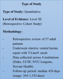 The selected article, “Ventral Hernia Repair with T-Line Hernia Mesh: A Multi-Institutional Experience” by Emovon et al. (2025), employs a quantitative, retrospective cohort design, which places it at Level III on the hierarchy of evidence. Conducted across four leading institutions—Duke University, UCSF, NYU Langone Health, and Novant Health—the study assessed 57 adult patients who underwent elective ventral hernia repair with T-Line® mesh between October 2020 and December 2022: Analyzing a Research Article: Post-Operative Hernia Repair.
