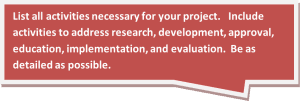 As you consider the activities necessary to implement your capstone project, you will find many similarities between the “planning and implementation” phases of the nursing process and the “work schedule” used to guide the capstone project.  In both cases, these steps serve as an action plan to direct specific activities and tasks that will facilitate achieving a specific outcome.  In the case of your project, the work schedule serves as a dynamic plan to communicate the activities and tasks that are necessary to perform to successfully achieve your project outcome.