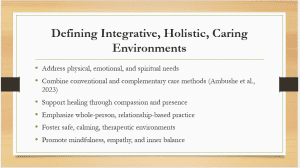 Hello everyone, my name is (your name). Today’s presentation is on interventions promoting an integrative, holistic, caring environment. Welcome
