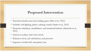 The intervention suggested is to renovate a staff break room into a healing room, specifically, and it will be used to facilitate relaxation and emotional renewal (Muir et al., 2022). The room will include soft lighting, natural elements such as indoor plants, and soothing sounds, all of which are components of a restorative and calming environment (Szabo et al., 2023). The aim is to provide a peaceful environment where nursing staff can stop, relax, and be present at work (Menardo et al., 2022). This intervention was selected to address increased stress and burnout among healthcare staff, issues that profoundly impact morale, staff retention, and the quality of care provided to patients. A healing space provides staff with a respite to rejuvenate, leading to improved focus, emotional balance, and job satisfaction. Ultimately, when staff are emotionally nurtured, patients receive more attentive, compassionate care. This evidence-based, cost-effective project is congruent with the hospital’s holistic, person-centered practice philosophy.