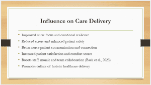 Establishing a healing environment for employees indirectly improves the quality of care being provided in the hospital. A peaceful environment where nurses can unwind increases focus and emotional resilience, allowing them to respond more effectively and wisely to patients’ needs. With less tension, mental performance is improved, medical errors are reduced, and safer care is improved. A more emotionally balanced nursing staff improves nurse-patient communication and strengthens intimate, trusting relationships. All these factors combined promote greater patient satisfaction and comfort, as patients sense they are more visible, heard, and cared for. Staff morale also benefits, as cooperative access to a restorative space fosters team bonding and support (Baek et al., 2023). Ultimately, this intervention creates a sustainable culture of whole-person, patient-centered care in which wellness is prioritized at every level, from patient experience to frontline staff. It redesigns care delivery by putting wellness, empathy, and human connection at the center.