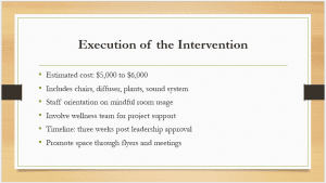 Implementation of the healing space intervention is an inexpensive, well-considered step that utilizes available hospital resources. The projected $5,000 to $6,000 budget includes comfortable seating chairs, an aromatherapy diffuser, calming plants, and a sound system to promote relaxation. Once funding and leadership are secured, transforming the space would only take about three weeks. Staff will receive a brief orientation about how to use the room respectfully and mindfully to continue reinforcing the room’s intention of being a place to relax and renew. A Wellness Team will implement and guide the room and ensure the staff’s needs are met. The intervention will be promoted through internal channels, such as meetings, visually appealing flyers and engagement to increase awareness and participation. Structure promotes smooth execution and maximizes impact and immediate and long-term usage of the space.