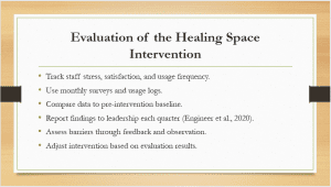 Three primary outcome objectives for the evaluation of the healing space intervention are staff stress levels, job satisfaction and occurrence of room usage. Perceived stress reduction and overall satisfaction with the intervention will be assessed monthly on anonymous survey forms. Moreover, usage logs of how the space will be used will also be kept. The impact will be measured by comparing these to baseline data taken before the intervention. Quarterly reports containing findings will be shared with hospital leadership to assist decision-making regarding the impact of program improvement (Engineer et al., 2020). Increased usage, positive survey responses, and reports of improved well-being will identify successes. Open-ended survey responses and observational feedback will be used to assess barriers, such as problems of low participation or scheduling. The findings of this evaluation will be used to inform appropriate modifications to the intervention to maintain relevance and effectiveness for staff needs.
