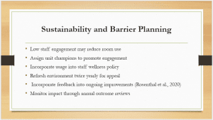 Maintaining the healing space intervention will necessitate continued attention to engagement, relevance, and integration into hospital culture. Low staff use, whether because of excessive workloads or lack of familiarity, is one of the barriers that may get in the way. To mitigate this, unit champions who will actively encourage use and model usage will be identified so the space continues to be visible and valued. Incorporating the healing room into the hospital’s wellness policy formalizes it as a normal support resource, not an optional amenity. Decor and sensory features will be updated biannually to keep the space appealing. Staff will be surveyed regularly to assess satisfaction, staff priorities, and areas for change. Feedback will be used to make incremental changes to align the space with staff needs (Rosenthal et al., 2020). Finally, an annual audit will assess usage patterns and well-being outcomes to ensure that the intervention continues to be effective, sustainable, and embedded in the general hospital culture of whole-person care.