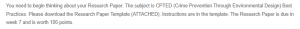 You need to begin thinking about your Research Paper. The subject is CPTED (Crime Prevention Through Environmental Design) Best Practices. Please download the Research Paper Template (ATTACHED). Instructions are in the template. The Research Paper is due in week 7 and is worth 100 points.