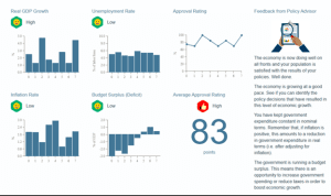 The simulation provides an economic outlook for each year to reflect how interconnected economies are where both national and global economic outlooks are visible. For instance, government expenditure is based on the government’s budget, which only offers a national outlook. Furthermore, a few aspects, such as inflation, have a close association with global economic dynamics. A change in global inflation rates influences the national inflation rate.