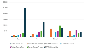 The visual representation of the data has made it easier to identify several things that could have been otherwise hard to identify. A table that provides the total sales for each month is provided. The table offers an insight into the numerical amounts for each food item offered by the restaurant. It is possible to compare the performance of each food item per month. Additionally, a graphic drawn from the data in the table is used to visualize the revenue generated from selling the food items. Notably, this graphic representation makes it easier to identify the product that performs better. For example, Sopapillas performed far more than others in the first two months. However, the revenue generated from the food items reduced significantly in the last two months. Essentially, this provides an insight that the graphic provided makes it easier to observe trends in performance for each product. It is from these observations that informed decisions can be made.