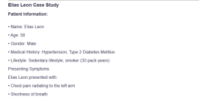 ELIAS LEON I HUMAN CASE STUDY IS A 62-YEAR-OLD MALE WITH A HISTORY OF HYPERTENSION, TYPE 2 DIABETES, AND DYSLIPIDEMIA. HE IS A NON-SMOKER AND CONSUMES ALCOHOL OCCASIONALLY. HE REPORTS EXPERIENCING SHORTNESS OF BREATH, FATIGUE, AND SWELLING IN HIS LEGS FOR THE PAST FEW WEEKS.