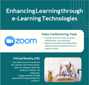 This week, you will create an infographic on e-learning technologies. Your infographic needs to show the different technologies and how they impact learners. The purpose of this assignment is to increase your awareness of e-learning technologies and how the technology you select can be used to improve learning within an organization of your choosing.