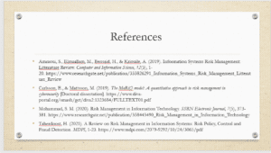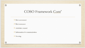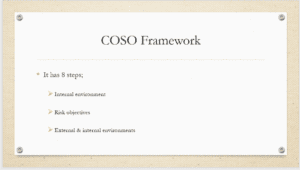 The COSO framework has eight multidirectional steps (Amraoui et al., 2019). The internal environment describes the organization’s culture. Step two includes identifying the risk objectives that the organization could experience. Step three checks on the external and internal factors that could affect an organization. In an IT environment, this would identify cyberattacks that could be experienced from within and outside an organization. For instance, a virus attack could be facilitated internally by end-users unaware of the practices of not running files attached to emails sent by unknown persons.