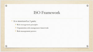 The ISO framework has three parts (Amraoui et al., 2019). The first part focuses on risk management effectiveness. This ensures that all risk management principles are incorporated, including a structured plan for managing the outlined risks. The second part ensures that all risk factors are reported (Amraoui et al., 2019). This information facilitates decision-making for enhanced risk management. The third-party ensures that risk management implementations are continuously monitored and amended (Amraoui et al., 2019).