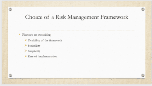 Summarize risk management concepts. Include the different frameworks you could use and why you might choose specific frameworks.