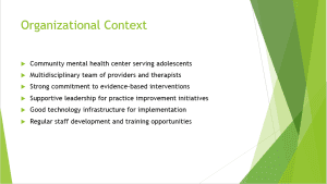 Our community mental health center serves a heterogeneous population of adolescents aged 12-18 with various mental health problems in urban and suburban communities. There is a robust organizational culture of evidence-based practice with leadership that consistently encourages innovation and improvement in practice. This support is conducive to an environment prepared for the implementation of change. The personnel are a multidisciplinary team of psychiatrists, psychologists, social workers, and psychiatric nurses who collaborate in the delivery of mental health services. We possess a robust electronic health record system with the ability to accommodate new treatment protocols and outcome measures. The center holds regular staff meetings, monthly case conferences, and quarterly staff training on clinical skill development and implementation of best practices. Organizational climate surveys done recently indicate high staff engagement and openness to quality improvement activities, which is a good indication of readiness to implement new evidence-based practices in adolescent depression treatment.