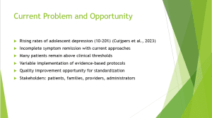 While using varying treatment methods for depression among adolescents, our center has realized many patients who arrive with partial remission of symptoms. According to Cuijpers et al. (2023), depression affects 10-20% of adolescents across the globe, thereby making it a significant clinical problem with potential long-term consequences. Our internal quality measures over the past 18 months indicate that approximately 45% of depressed adolescents remain above clinical cutoffs following completion of standard treatment, a finding that is consistent with those of Stikkelbroek et al. (2020), where 41.6% remained above clinical cutoffs at post-treatment. Chart audit demonstrates uneven application of evidence-based protocol with non-systematic use of core CBT components. This offers a great opportunity to consolidate our depression treatment modality and optimize outcomes. Key stakeholders include adolescent patients and their families who lodge complaints about incomplete recovery, clinical practitioners who prefer more effective interventions, and administrators who are concerned with quality measures and resource utilization. Closing this gap would make a considerable difference in clinical outcomes and patient satisfaction.