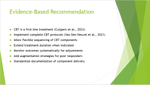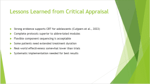 Based on a critical appraisal of four high-quality studies, I recommend implementing complete CBT protocols with flexible component sequencing for adolescent depression treatment. Cuijpers et al.’s (2023) comprehensive meta-analysis of 409 trials with 52,702 patients showed moderate effects specifically for adolescents (g=0.41), providing Level I evidence supporting CBT as a first-line treatment. Van Den Heuvel et al. (2021) demonstrated that while complete protocols incorporating all components are necessary for optimal outcomes, the sequence of delivering cognitive restructuring, behavioral activation, problem-solving, and relaxation can be flexible without compromising effectiveness. Walter et al. (2021) highlighted CBT effectiveness in routine practice settings with large effect sizes (d=0.85-1.30) for clinical patients, though noting that extended treatment duration may be necessary for full symptom remission. Systematic outcome monitoring is essential for identifying poor responders early, enabling timely implementation of augmentation strategies. Standardized documentation will facilitate quality assurance and continuous improvement while allowing flexible clinical decision-making within the evidence-based framework.