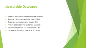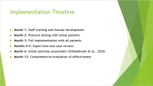We will track several measurable outcomes to comprehensively evaluate implementation success and clinical impact. The primary outcome measure will be a reduction in PHQ-9 depression scores, with a target improvement of at least 50% from baseline and scores below the clinical threshold of 10. This aligns with validated measures used in our reference studies. Secondary outcomes include remission rates (aiming for >50% of patients below clinical threshold compared to the current 30%) and treatment completion rates (target >80% compared to the current 65%). Patient satisfaction will be assessed using standardized surveys administered at treatment midpoint and completion. Provider competence will be evaluated through structured supervision ratings and self-efficacy measures before and after implementation. Documentation quality will be assessed through structured chart audits examining adherence to protocol components, similar to the methodology in Walter et al.’s (2021) study. These metrics create a balanced scorecard approach to evaluating clinical outcomes, process quality, and stakeholder perspectives. Data will be analyzed quarterly to identify trends and opportunities for adjustment, with statistical comparison to the pre-implementation baseline.