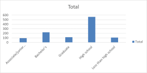 Graduate degree holders (n=116) and those with less than high school education (n=109) show similar frequencies, while associate/junior college degree holders represent the smallest group (n=95). The stark elevation of the high school category, combined with the gradual decline in frequency for both higher and lower educational levels, creates an asymmetrical distribution pattern.