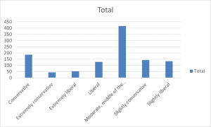 Moving from the center, the frequencies gradually decrease toward the extremes, with “Slightly conservative” (n=143) and “Slightly liberal” (n=134) showing similar frequencies, followed by “Conservative” (n=186) and “Liberal” (n=129) maintaining comparable levels. The extremes of the political spectrum show the lowest frequencies, with “Extremely conservative” (n=44) and “Extremely liberal” (n=54) representing the smallest groups.