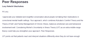 I appreciate your detailed and insightful conversation about people not taking their medications in correctional mental health settings. Your approach, which combines Kolcaba’s Comfort Theory and the Theory of Self- and Family Management of Chronic Illness, balances emotional care and behavioral involvement well. Considering Mishel’s Uncertainty in Illness Theory (UIT) as an extra middle-range theory could help you strengthen your approach: Peer Responses.