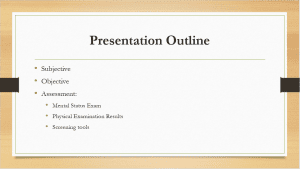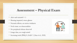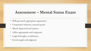• Assessment:Discuss the client’s mental status examination results and physical examination results if completed. You may provide screening tool results if completed. Do NOT provide your differential diagnosis in this video.