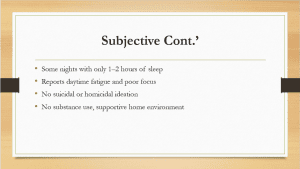 • Subjective:What details did the client provide regarding their chief complaint and symptomology to derive your differential diagnosis of a sleep-wake disorder? What is the duration and severity of their symptoms? How are their symptoms impacting their functioning in life?
