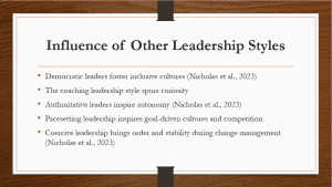 Apart from the affiliative leadership style, the other five leadership styles in Goleman’s leadership model are also crucial in an organizational setting. The democratic leadership style fosters inclusivity, where every follower feels valuable to the organization, knowing that their input matters. The coaching leadership style inspires curiosity as leaders help followers attain individual development and discover their hidden capabilities. On the other hand, visionary and authoritative leaders foster an autonomous culture by setting clear expectations and informing followers of the expected end goal. Pacesetting leadership inspires goal-driven cultures and competition as leaders set a high bar for followers. Finally, even though coercive leadership seems undesirable, it is vital during change management as it brings stability and order since followers must comply with what a leader commands (Nicholas et al., 2023).
