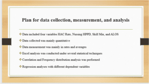 The analyzed data contained four variables. The Hospital-acquired condition rate (HAC Rate) is the number of hospital-acquired conditions (HAC) per 1,000 discharges which measures the extent of hospital errors. Nursing hours per patient day (Nursing HPPD) represents the number of nursing staff hours per patient day (HPPD); measures nurse staffing level and the Skill Nursing mix represents the percentage of nursing staff hours provided by Registered Nurses (RN); measures skill mix of nursing staff. The average length of stay (ALOS) represents the number of inpatient days per hospital discharge, which measures hospital efficiency. The analysis tool used was Excel, which enhanced the analysis of correlations, descriptive statistics, regression analysis using different variables, and distributions using a histogram.