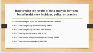 The coefficients of correlation between HAC rate and ALOS indicate that increasing the length of stay will increase the chances of HAC. Lowering the number of days a patient spends in the hospital will be beneficial in reducing the HAC rate. Particularly, increasing the ALOS by one unit will increase the HAC rate by 0.115 units. Similarly, a unit change in skill mix by 0.4115 will change the HAC rate by one unit. On the other hand, a decrease in nursing HPPD by -4.1639 will increase the HAC rate by one unit.