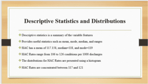 HAC rate has a mean of 117.1578, a median of 118, and a mode of 119 with a standard deviation of 4.893. The sample variance is 23.94. A high HAC score is synonymous with ineffective hospital operations and poor healthcare outcomes. By dividing 117.157 with 1000 patients, the rate is 0.117. The recommended HAC rate is between -3 and +3 (Mitchell, 2018). The mean of number of nursing staff hours per patient day (HPPD) is 3.94, which measures nurse staffing level. However, due to the larger correlation effect between HPPD and HAC rate, the hospital can increase the average nursing HPPD for a better HAC rate. The mean skill mix can also increase to lower the HAC rate. This means improving the number of registered nurses or slightly increasing the number of hours the registered nurses provide services. Also, lowering ALOS to a lesser average will be beneficial for the hospital’s ALOS.