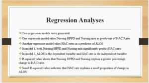 The regression analysis entailed generating two regression models, with one model taking Nursing HPPD and Nursing mix as predictors of HAC Rates, while another model takes HAC rates as a predictor of ALOS. In the first model, both the Nursing HPPD and Nursing mix significantly predict HAC rates, as shown by the significance of the F value and the p-values smaller than 0.05. In model 2, ALOS is the dependent variable, and HAC rate is the independent variable. R-squared values indicate that HPPD and nursing explain a greater proportion of change in HAC rates (Field, 2018). The small R-squared value indicates that the HAC rate explains a small proportion of change in ALOS. However, unlike the correlation model, the regression model shows that skill mix and ALOS are positively related to HAC rate, while Nursing HPPD is negatively related to HAC rates.