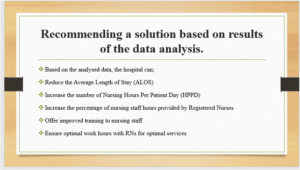Although the HAC rate at the hospital is within the recommended range, the hospital can implement a number of strategies to further reduce the HAC rate based on the analysed data. Firstly, the hospital should aim to reduce the Average Length of Stay (ALOS) by improving the treatment processes and efficacy, as Horn et al. (2022) recommended. Logically, an increased length of stay in a hospital will increase the probability of errors and conditions that arise for patients in the hospital. The hospital can also increase the number of Nursing Hours Per Patient Day (HPPD), which closely corresponds to increasing the percentage of nursing staff hours provided by Registered Nurses. However, the analysis recommends optimizing the number of hours the nursing staff works to ensure optimal working conditions. For instance, subjecting nurses to lengthy working hours may lead to more errors and poor healthcare outcomes. The hospital can also offer improved training to nursing staff.