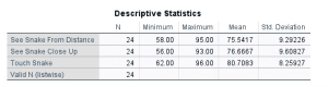 The results indicate varying levels of anxiety between the three conditions of snakes to which participants were exposed. The mean of the anxiety measure of perceiving a snake at a distance (M = 75.54, SD = 9.29) is slightly less compared to perceiving a snake at closer proximity (M = 76.67, SD = 9.61), implying that proximity might enhance anxiety. Nevertheless, the highest levels of anxiety were registered within the touch condition (M = 80.71, SD = 8.26), implying that physical touch with a snake elicits much greater levels of anxiety compared to mere vision of the snake.
