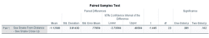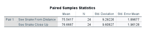 A paired-sample t-test was conducted to compare levels of anxiety at a distance to levels of anxiety up close to a snake. No significant difference was revealed between levels of anxiety at a distance (M = 75.54, SD = 9.29) and levels of anxiety up close to a snake (M = 76.67, SD = 9.61); t(23) = -1.45, p = .162. The slightly higher mean measure of anxiety was revealed within the up-close condition, although this was not statistically significant.