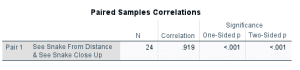 The strong positive correlation between the two conditions (r = .919, p < .001) also signifies those participants who had a high measure of anxiety at a distance also had the propensity to have a high measure of anxiety up close to a snake with the measures of individual anxiety being fairly stable between the two conditions of viewing.