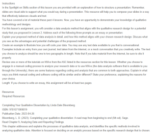For this lesson’s assignment, you will consider a data analysis method that aligns with the qualitative research design for a potential study that you proposed in Lesson 2. Address each of the following three prompts as an essay or presentation:
