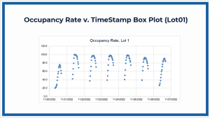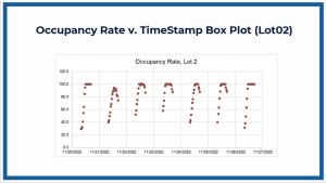 Motorists and drivers usually seek parking at different moments of the day, and with time, occupancy increases. This pattern is witnessed at different timestamps. By referring to the box plot for Lot01, we can infer that the occupancy rate is subject to the time of day. The peak occupancy rate occurred on November 21, 2022, reflecting increased demand for parking at this time. This is a pattern that reflects the dynamic character of occupancy of office spaces over time, with demand usually rising at particular hours.