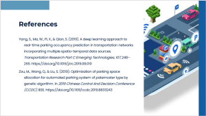 Yang, S., Ma, W., Pi, X., & Qian, S. (2019). A deep learning approach to real-time parking occupancy prediction in transportation networks incorporating multiple spatio-temporal data sources. Transportation Research Part C Emerging Technologies, 107, 248–265. https://doi.org/10.1016/j.trc.2019.08.010