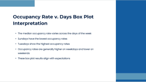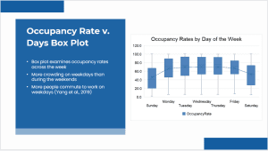 Examining the box plots of the week, there is a consistent difference in the varying days. Every day has a different median occupancy rate, with Tuesdays having the highest and Sundays having the lowest. The box plot also indicates that the occupancy rate tends to be elevated on weekdays compared to weekends. This is as expected since the city tends to have more activities on weekdays compared to weekends. The city tends to be more crowded on weekdays than weekends because people are commuting to work there (Yang et al., 2019), whereas there are fewer working individuals over weekends.