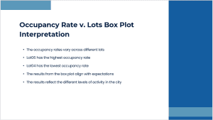 The box plot of occupancy by lot strongly indicates that different lots have different levels of occupancy. Lot06 is the lot with the highest level of occupancy, and Lot04 has the least. This is expected since people will be working in different parts of the city, and thus, some areas will have more demand for parking lots. Some areas of the city are more active and thus have more demand for parking lots, whereas others are less. This disparity in occupancy levels mirrors the different levels of activity in the different parts of the city and varying car park demands.