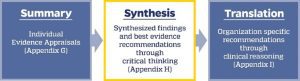 In this section, the EBP team takes into consideration all the above information related to the strength, quantity, and consistency of the synthesized findings at each level to generate best practice recommendations from the evidence. Consider: